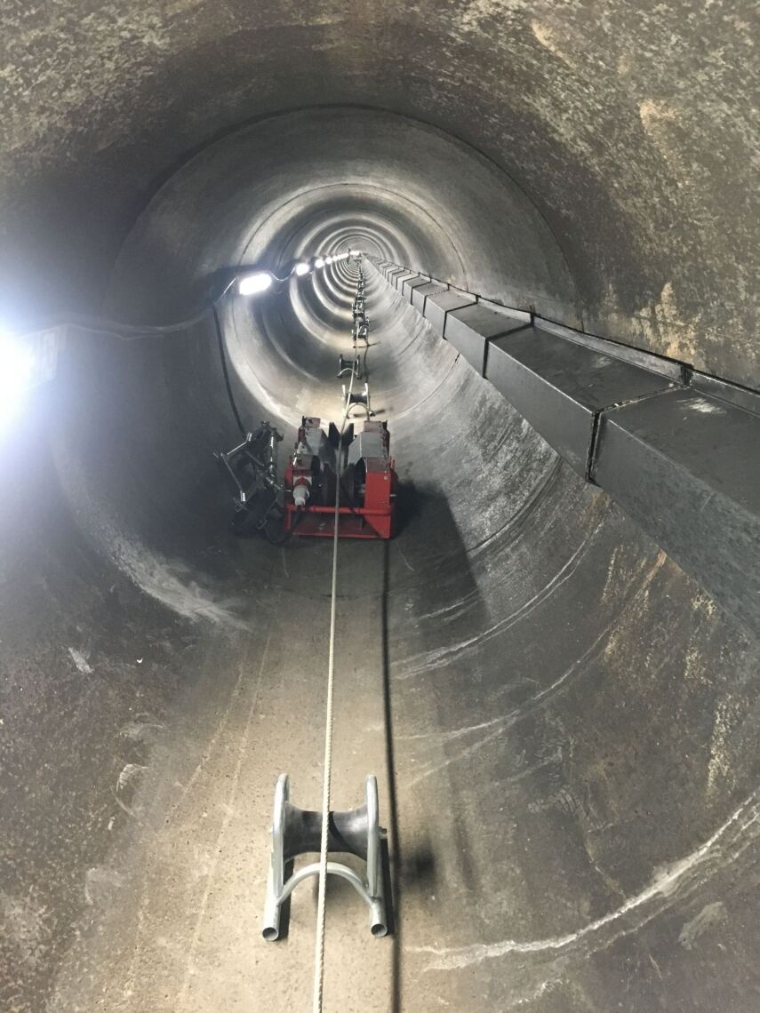 Due to the low water levels the compensating pipe could be used for a short time as a sewer. After cleaning the culvert, Elkom installed cables on synchronously operating Bagela cable pushing units and cable laying rollers. The cables were lowered from a Bagela cable drum trailer with adjustable drum brake to 30 m depth. Within 2 days the cables were laid.