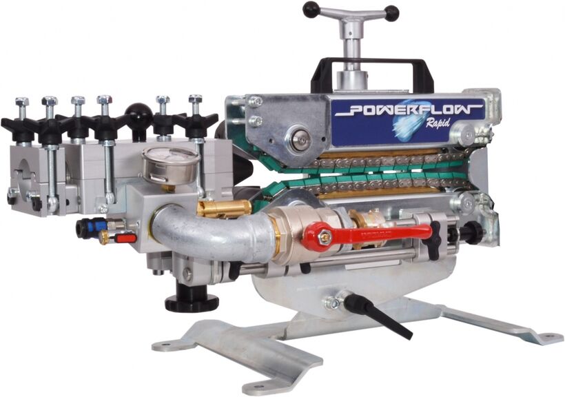 Designed to blow in optical fibre cable from dia.: 8-22mm into ducts of a dia. 32-50 mm. It is suitable for air- and water blowing. The drive chains are propelled by two low-wear and low-noise hydraulic motors which enable for- and backward movement of the cable. Only a few changes are necessary to change to different cable or pipe sizes. Flex-Block included