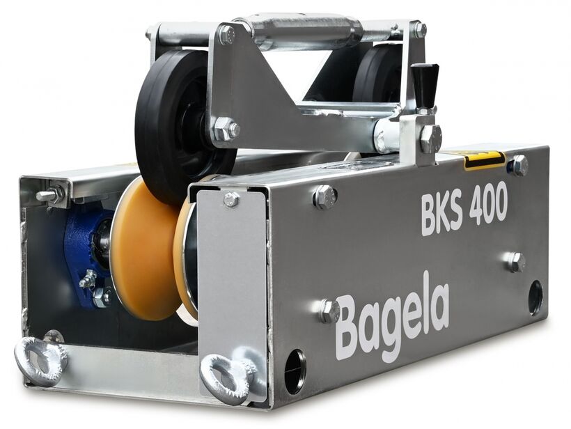 The Bagela cable and pipe pushing unit BKS 400 is designed for working sites with confined space, and is to be used also within buildings, power plants or on ships. It can be positioned directly into the cable tray because of the low weight and dimensions. The single capstan can be used for pulling in cables or pipes; the pushing device is also able to push or to pull in glass fibre rods with a diameter starting from 11mm.