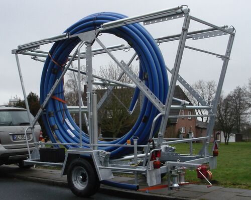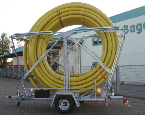 Whether with HDD drilling machines or all in pipe renewal processes, especially on urban working sites, the space is confined. With BRVT 09 /16 the pipe is guided from the top out of the basket parallel to the coil under the axle of the trailer to the rear. There is no bending tension on the pipe coil.